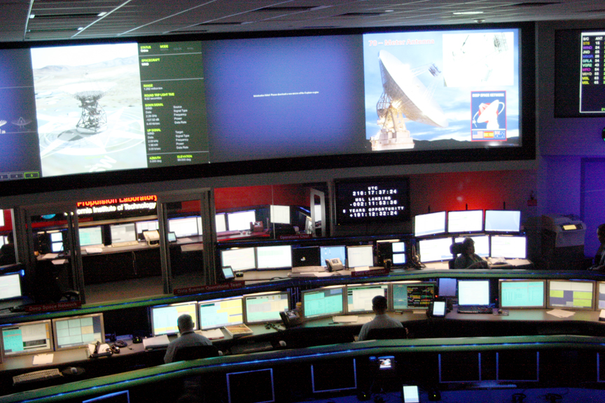 The control center (Black Room) in the Space Flight Operations Facility at JPL. All signals going to and from the Deep Space Network are coordinated here.
