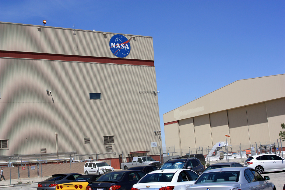 Dana gave us our nice NASA blue flight jackets and we drove to I-5 and northwest through the San Fernando Valley, taking Highway 14 north through the San Gabriel Mountains to Palmdale and Antelope Valley. We dropped off our luggage at the Hilton Garden Inn and walked to Olive Garden for lunch. We then drove out to the DAOF facility and got temporary badges. Walking into the main hangar building, we got to meet SOFIA for the first time. She filled up the east end of the hangar, her vertical stabilizer almost brushing the ceiling. We took pictures outside and inside.