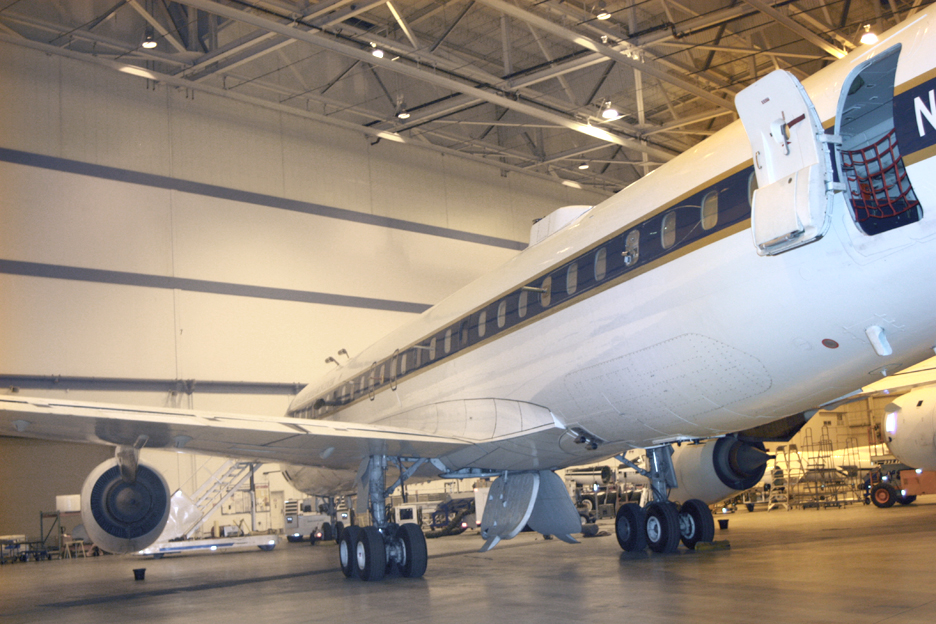 Eric then walked us around the side of the hangar past the DC-8 that is used for atmospheric research. It has nozzles and intake ports, instruments and radar aperatures sticking out of it on all sides and underneath. We counted about 20 instruments. It collects samples and data as it flies regarding atmospheric conditions and constituent gases. We have met a video team from Raytheon that is here to ride on the DC-8 as it records data of the IRIS mission this week.