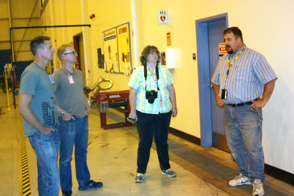 Eric then showed us the facility for recoating the SOFIA mirror every few years. The mirror is carefully removed and transported into this bay, where the aluminum finish and any oils or contaminants on the mirror are removed so that it is basically just glass (although a special type that resists cracking). It is then moved by ceiling crane into the next room and lowered into a large pressure vessel where all the air is pumped out and the mirror surface is electrically charged. Heating elements vaporize aluminum coils and the gas is attracted to the charged mirror. Within a few seconds, a new coating of aluminum about 1000 angstroms thick has been deposited.