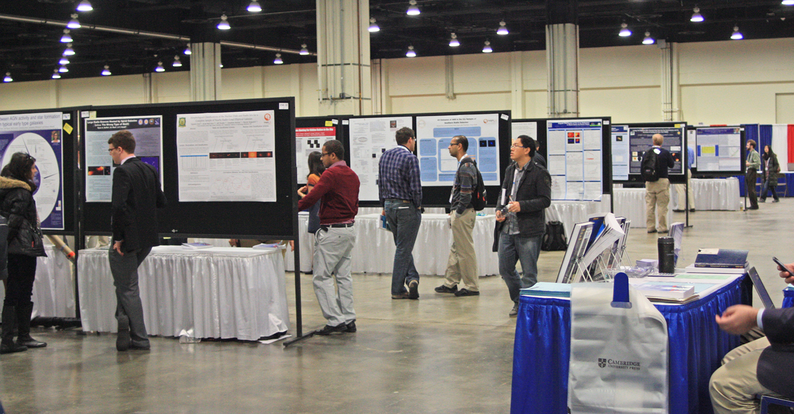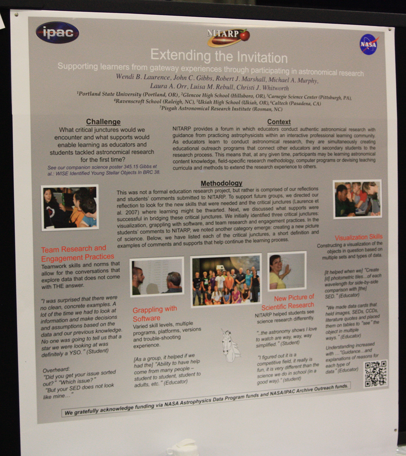 Today’s posters had an education and public outreach theme, and there were groups of high school students visiting various booths, such as using an infrared camera and a blow drier in the JWST booth. I looked around the poster sessions, which are divided into about five sections sandwiched between the exhibiter booths. The educational posters from the NITARP teams were up today, and I photographed them so that I could get a feel for what will be required of us.