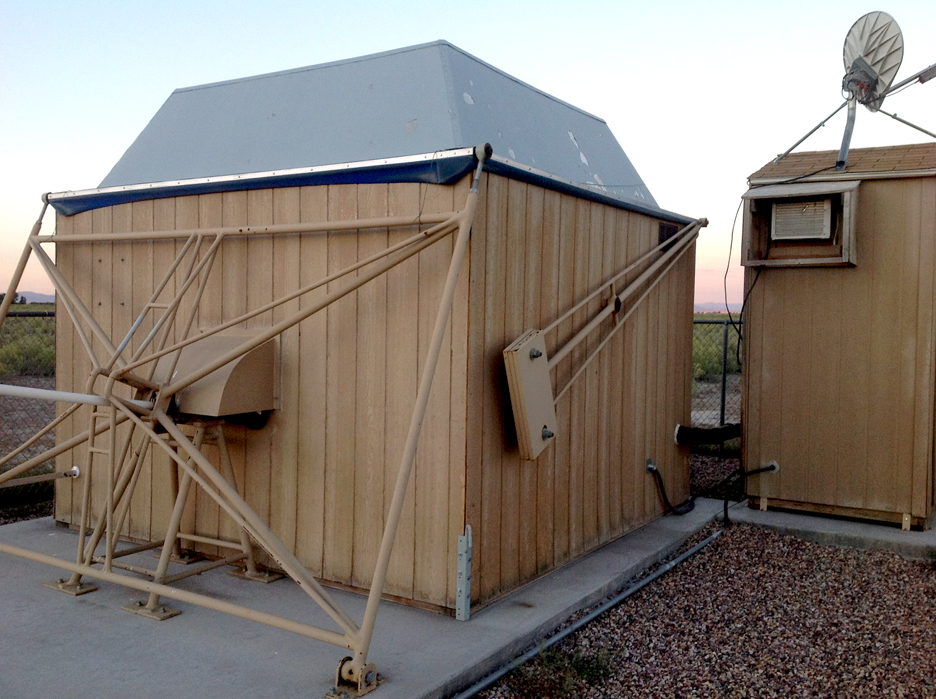 Close up view of ROVOR. The large building houses the scope and is called the Dog House. The smaller building houses the computer system and communications uplink. It is called the Outhouse. When the mosquitoes come out, it can get quite tight in there . . .