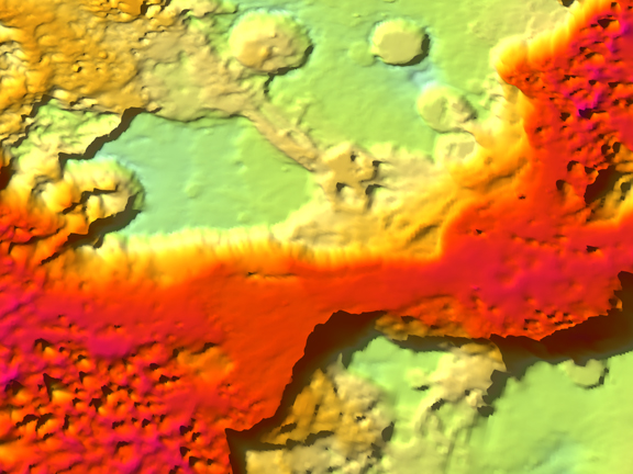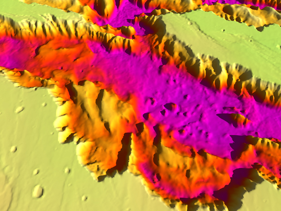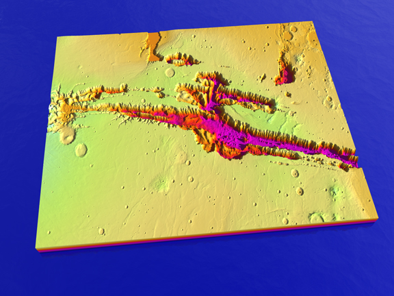 2. Further to the east, where the Valles Marineris drains through a narrow canyon toward the chaos terrain and the start of Ares Valles. Water flowed here for a long time.