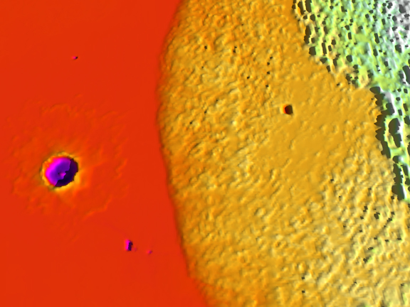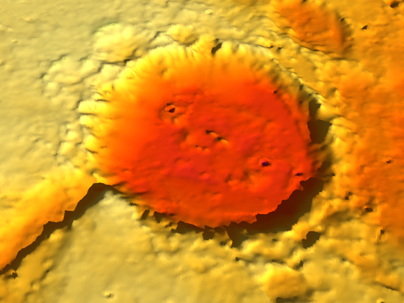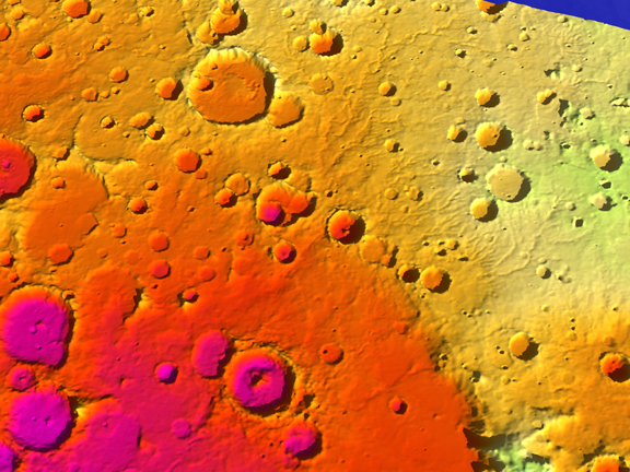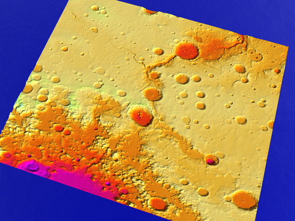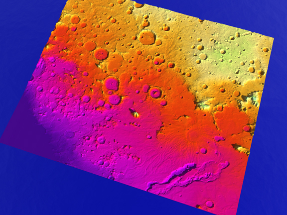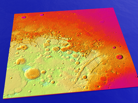 I then use the 3D model to create renders in my 3D software, adding a gradient texture that is altitude sensitive and printing out the final renders to the teams. The medium sized data becomes a context image and the smaller data becomes a detailed image of their landing site. The teams look up information about the site, as much as they can, and create a presentation using their renders and other images they find to justify why they want to land there, based on the criteria above.