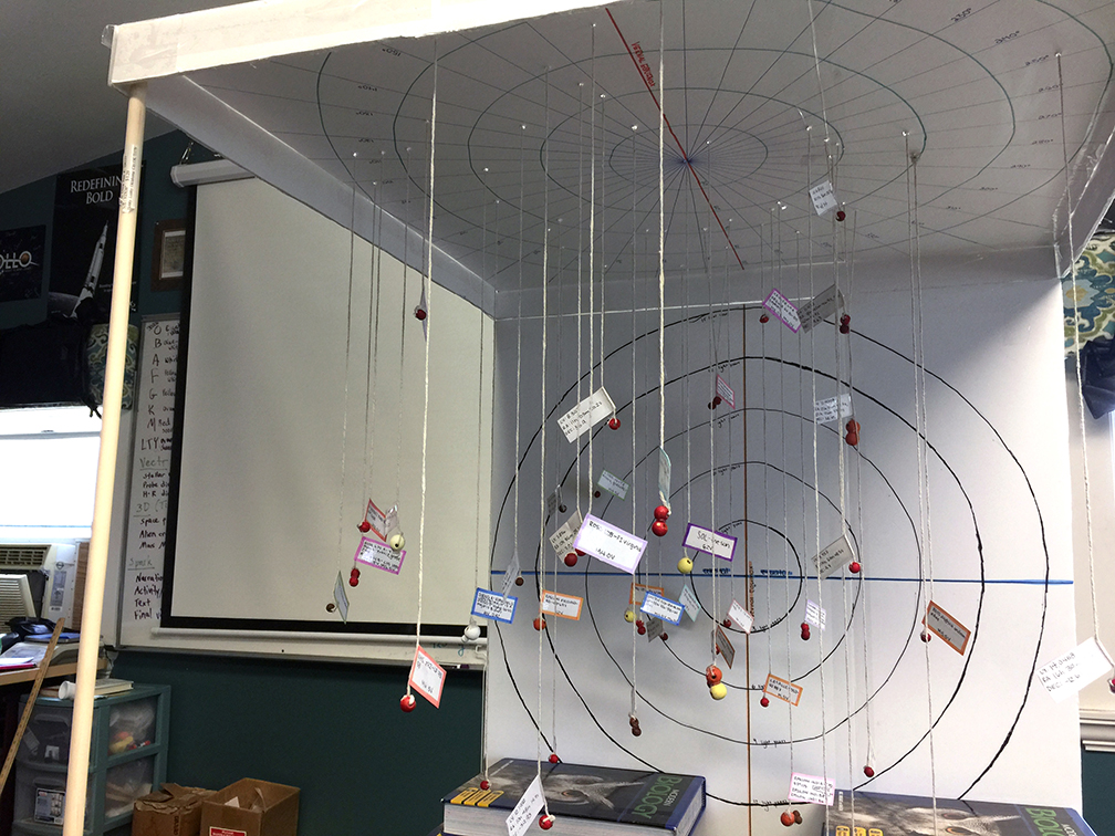 I finally put together a moderately complete list and developed my own lesson plan activity. Our first attempt used a large styrofoam ball in the center and the stars were beads glued on wooden skewers poked into the ball. Measuring the right ascension and declination was difficult, and the final model was not very accurate or complete. The next year my lesson improved – we hung the stars from the ceiling with black bulletin board paper around and strips of tape for the Vernal Equinox and Celestial Equator, using a primitive sextant to get the angles and proportional spacing correct. We got the stars mostly hung before I realized we had them backwards, so we tore it down and started over. Right Ascension had to be measured to the left, it turned out. It was a great improvement, but the stars were various sized styrofoam balls and didn’t hold up well with repeated use.