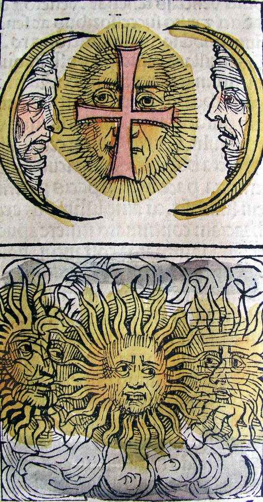 There have been many historic accounts of sun dogs; the term itself means an object that dogs (or follows) the sun. The Nuremberg Chronicles, a rare book full of wood cut illustrations, includes an image of a sun dog, and to the plains Indians of North America they were considered omens of bad weather and blizzards to come. There is quite a bit of truth to this, as the cirrus clouds that cause them often do precede a warm front which in the high plains can turn into a blizzard.