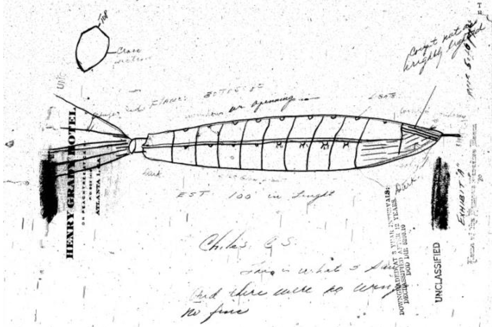 The pilots drew sketches of what they saw, and they match the description quite well – a cigar-shaped vehicle with flame coming out the rear and two rows of shiny windows.