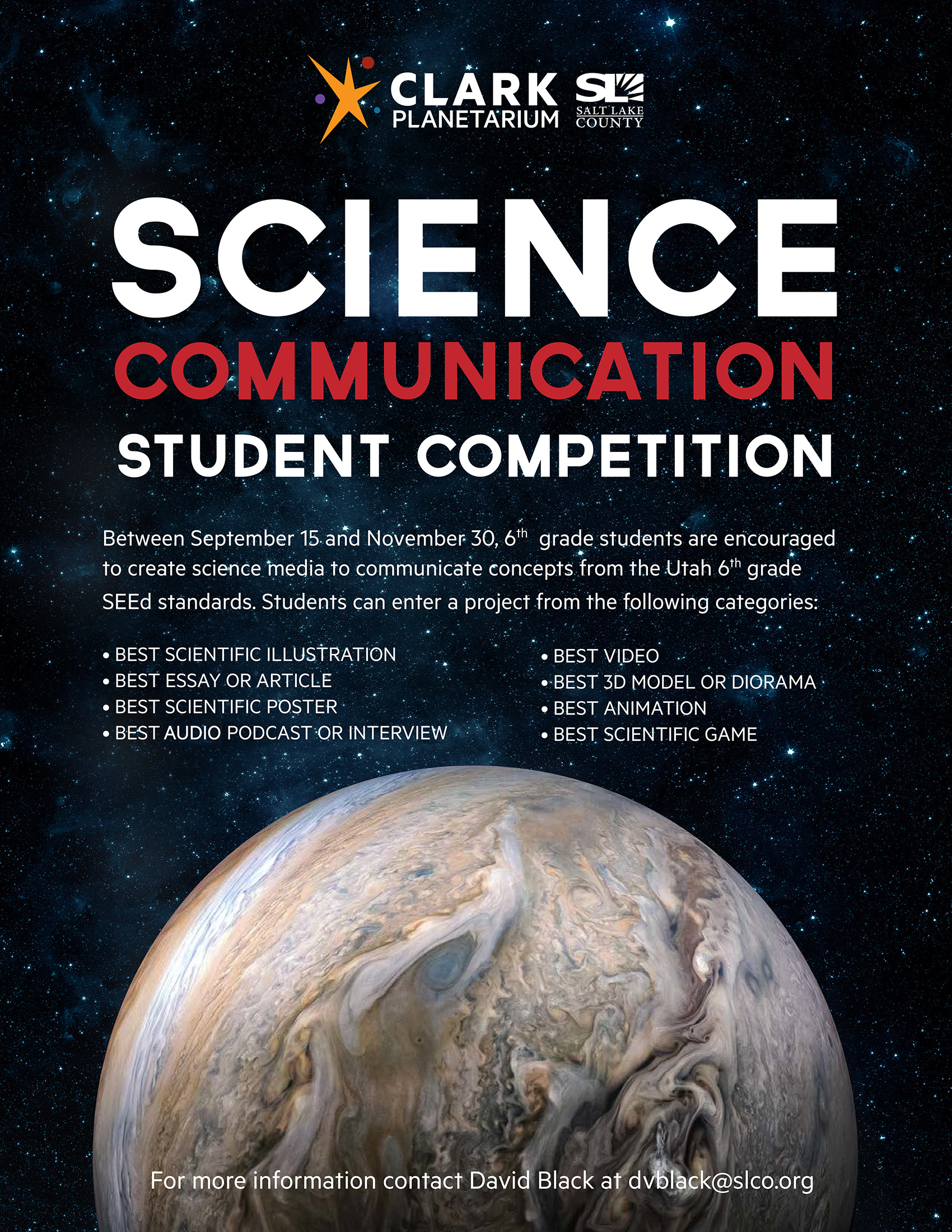 So I was left with a difficult situation: how to fulfill the mission of the planetarium and the responsibilities of my new full-time position while also creating a means to gather data on student-created digital media projects in science classrooms, the central question of my dissertation. Then a brainstorm hit me: what if I proposed a contest for Utah students for science communication, one of the SEPs of the Utah SEEd standards? Students would fulfill specific content standards while creating their own science media to effectively communicate the concepts. We would have participating teachers go through training workshops, then they would have their students compete in eight categories such as best article, best illustration, best podcast, best video, and so on. It could work! So I wrote up the proposal and presented it first to my supervisor (before he left) and then to the Education Programs Director and overall Planetarium Director. They were all enthusiastic about the idea, especially since it will involve continuing support and training for teachers during the contest. We often go out and present one-and-done workshops without really following up on how well teachers are implementing our programs or providing the needed support; this will provide a new model for our training and collect a great deal of data that can be used to improve the program in subsequent years. For this year, it will be a pilot program and can be placed under our Utah iSEE (Informal Science Education Enhancement) funding as long as it is directed at sixth grade students.