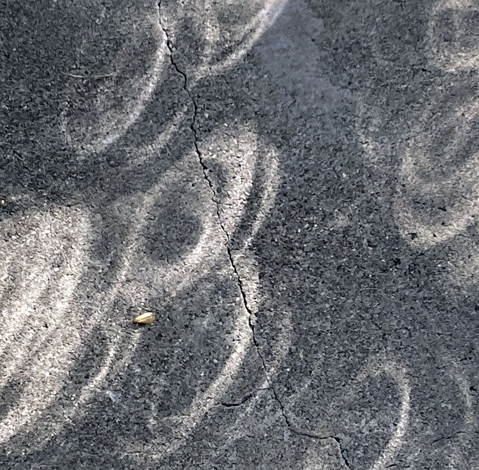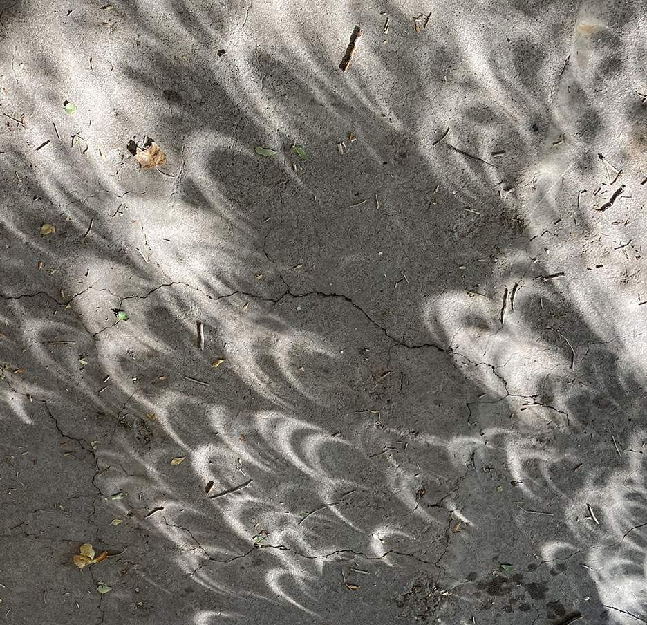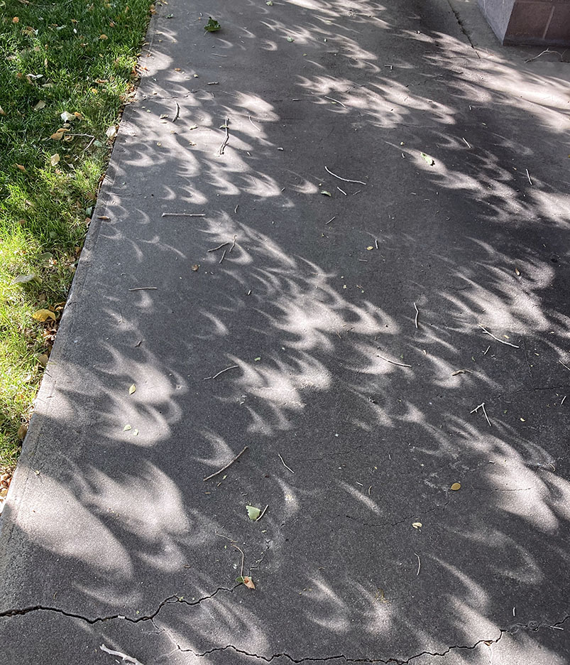 And it was progressing. A dark slice appeared in the upper right edge of the sun (I wore my own eclipse glasses, of course) as the sun shined through the power lines on the other side of the road. The PUNCH pinhole projectors were working well, and I took photos of people holding them and seeing crescent suns appearing on the sidewalks instead of the circle, square, and triangle shapes. But the most interesting things were the natural pinhole projections coming through the leaves of the many trees lining the park. Gradually the sun became a thinner and thinner crescent until 10:32 am, when right on schedule a complete and perfect ring of fire appeared around the moon. I took as many photos as I could but my cell phone didn’t have the capability to focus through the eclipse glasses. Then, about four minutes later, the ring became a crescent again.