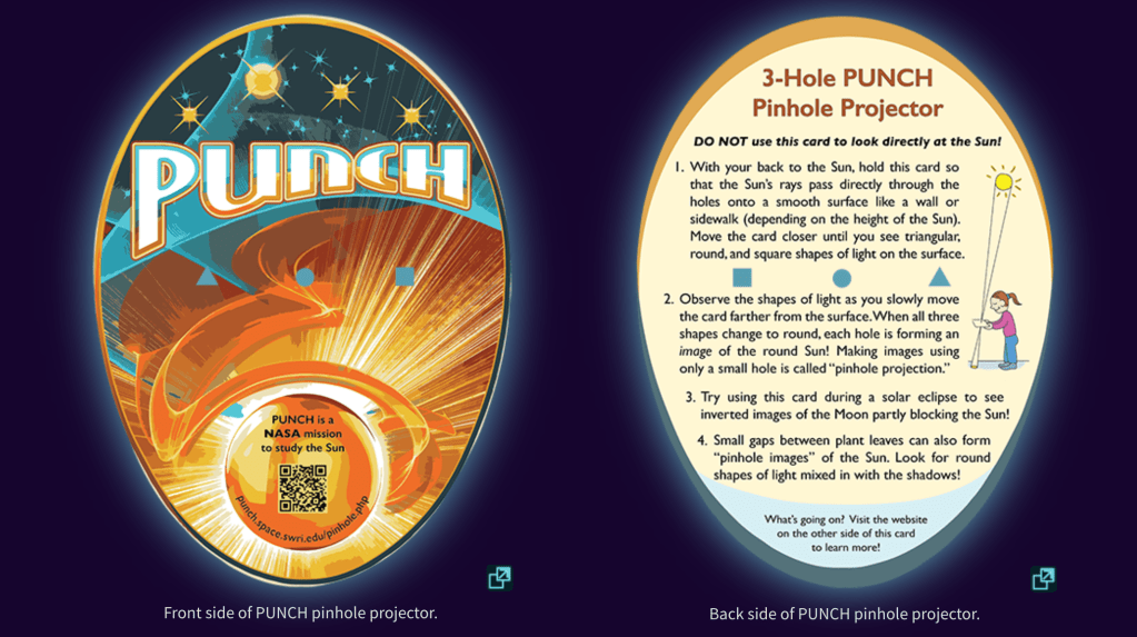 He had already purchased the glasses which he showed to me sitting in large boxes at our storage and shop area in the Gateway Center near the planetarium. He had also purchased mailing boxes and tubes for them to be shipped in, and had printed out all of the labels. According to his calculations, we would need to send out about 113,000 pairs of glasses along with instructions for how to safely use them and 3-hole PUNCH pinhole projectors, which were oval pieces of cardstock printed on both sides with three holes punched in them, one a circle, one a square, and one a triangle. These were to demonstrate how pinhole projection works – that close to the projection surface, the light takes on the shapes of the holes, but further away it takes on the shape of the light source.