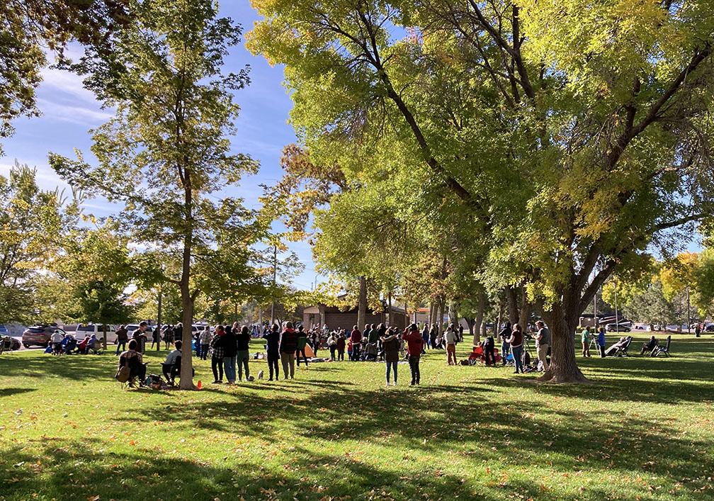 Cars were splitting off to go to the Little Sahara Sand Dunes. Some pulled off the road everywhere there was a parking area, such as at the Brush Wellman turnoff and by the Delta Airport. I found out later that Robert Bigelow was out at the Delta Cemetery. I pulled in to Delta Park at 9:15 just as the eclipse was starting and got set up. The park was full of people with their chairs set up wherever the sun shined through the trees that line the park. I was in the northeast pavilion where we’ve done high school class reunions before.