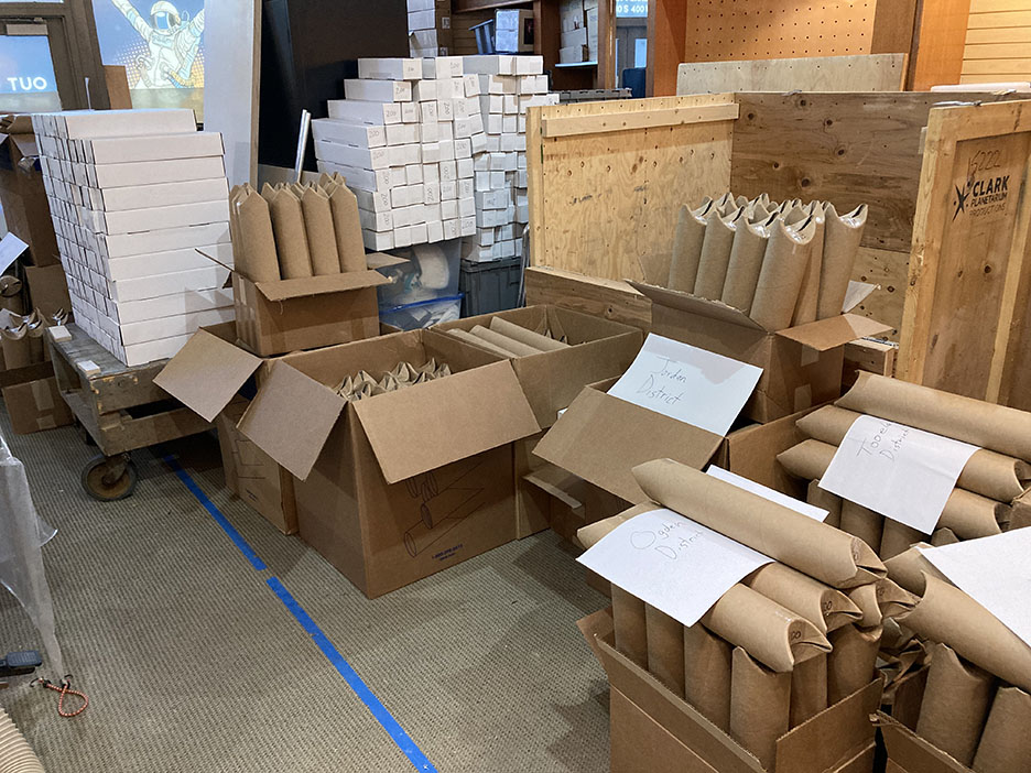The solar eclipse glasses came in packs of 50, so I had to round up to the next highest 50 and many of the elementary schools have just over 100 6th graders – like 110 or 120, because they often have three 6th grade classes. This meant rounding up to 150 to also ensure all students would have them if a class had more students than the state estimates, plus glasses for teachers. Because of this constant rounding up, I wound up calculating that we needed to send 122,000 pairs of glasses give or take 100 or so. Then came the packaging into boxes. We could fit up to 200 (four packages) of glasses in a box or tube along with a few PUNCH pinhole cards, safety instructions, and letters that I will describe in a moment. It was a tight fit. Depending on the school we would have several different amounts in boxes and tubes that were then taped together into packages and a label applied. We then separated them out by school districts into boxes. For Utah’s rural schools in the central, southwest, southeast, and northeast corners of the state we combined the districts in those areas into piles to send to the regional service centers. It was a huge undertaking and took up all of the free space in our storage area.
