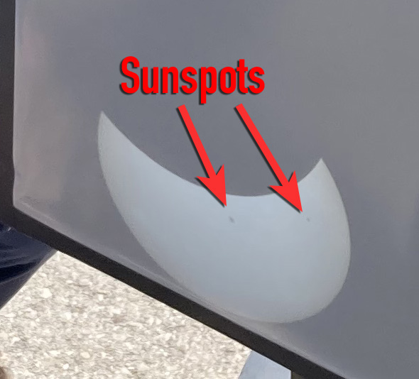 I helped to man a solar projector, which used a regular small telescope to project the sun’s image onto a piece of translucent plastic stretched over a box to make a primitive screen. This inverted image was actually better than looking through the actual scopes with solar filters. I could clearly see two sunspots, and as the shadow of the Moon progressed I wagered with visitors if the smaller of the two would get covered by the Moon, which it did. It was difficult keeping the scope tilted toward the sun as it rose higher in the sky, and I had to stuff whatever I could under the Dobsonian mount, then focus the sun in manually and hold it in place. But I had quite a few visitors who took photos. We had some newspeople there from Fox 13, who interviewed Jason Trump. I just stayed in the background; I’ve already used up my allotment of Andy Warhol’s 15 minutes of fame.